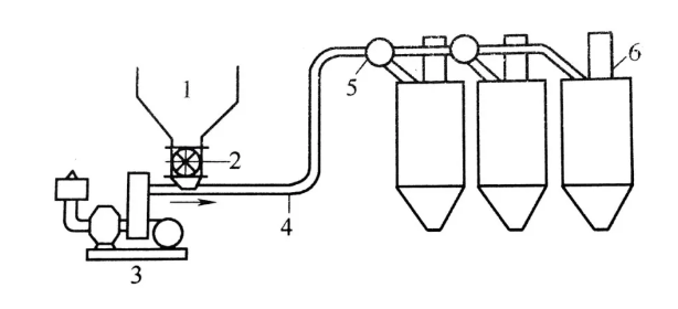 1-料倉;2-供料器;3鼓風(fēng)機(jī);4-輸送管;5-轉(zhuǎn)向閥;6-除塵器